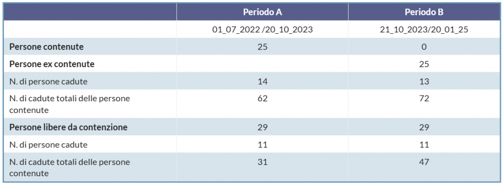Questo approccio, basato su evidenze scientifiche, dimostra che la contenzione non riduce il rischio di cadute. Dopo la sua eliminazione nella RSA Accorsi, l’analisi dei dati effettuata sui 54 residenti sempre presenti per l’intero periodo valutato (Periodo A pre “s-contenzione” 1/07/22 – 20/10/23 e il periodo B post “s-contenzione” 21/10/23 – 20/01/25) ha confermato che il 40% dei residenti contenuti non è mai caduto e il 20% è caduto meno una volta “liberato” dalla contenzione (Tabella 1).