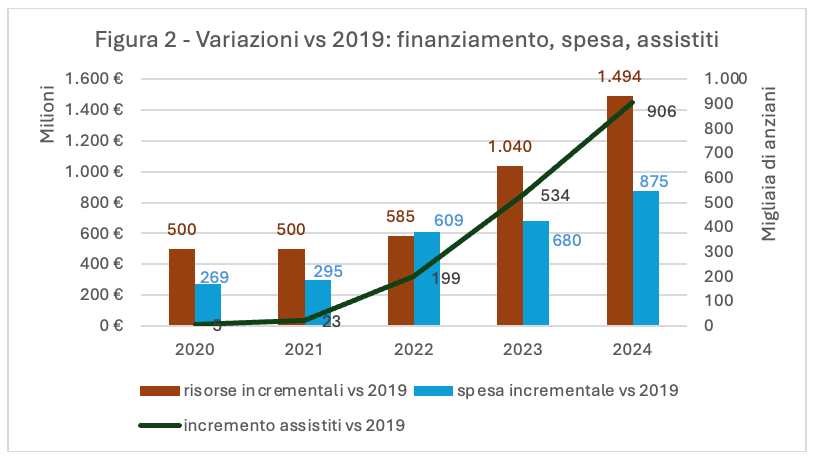 Ma quanto è veramente aumentata la spesa del Ssn per la domiciliarietà? Secondo l’Istat, nel 2024 sono stati spesi meno di 4,2 miliardi, con un incremento rispetto al 2019 di circa 875 milioni. La crescita della spesa corrisponde a poco più della metà delle risorse disponibili per l’Adi nel 2024: circa 1 miliardo e mezzo tra Pnrr e Dl 34 come illustrato nella figura 2.